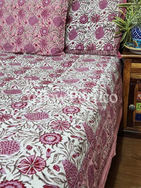 Gulabi Dahlia Hand Block Printed Bedsheet with Pillow Cover